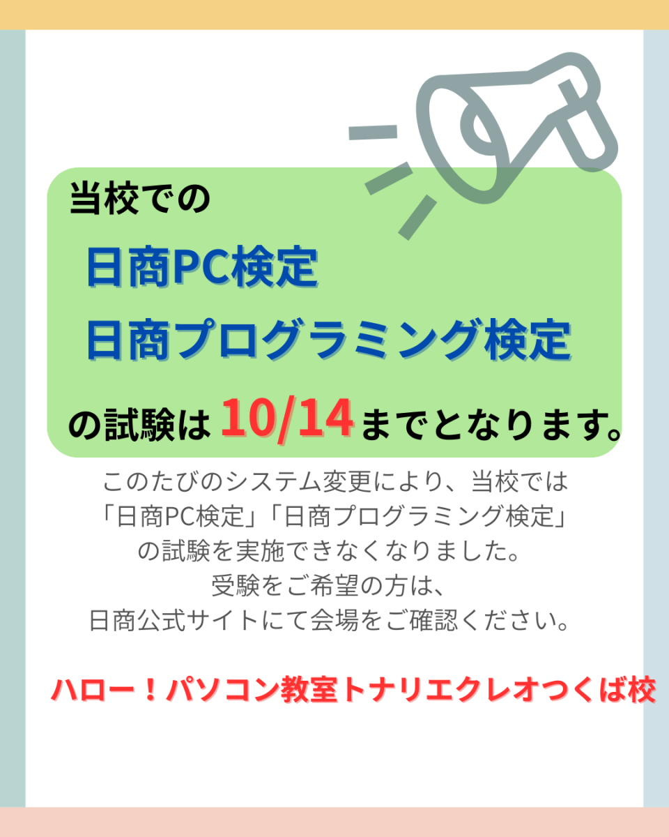 日商PC検定・日商プログラミング検定試験について 2025/09/25 日商PC検定・日商プログラミング検定試験につきまして、試験システムの変更に伴い、当校での実施は2025年10月14日をもって終了となります。長らくご受験いただき、誠にありがとうございました。今後の受験をご希望の方は、他の試験会場をご利用いただくようお願いいたします。